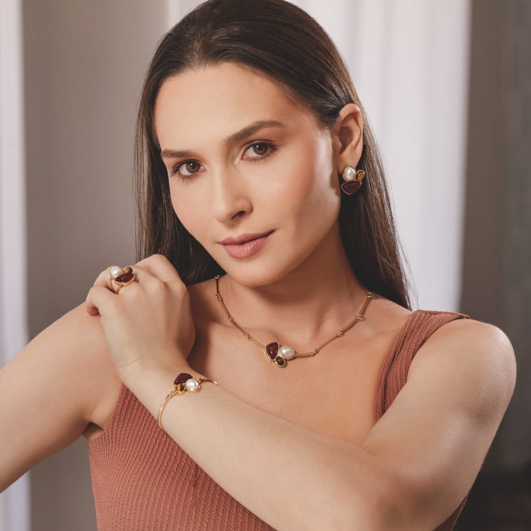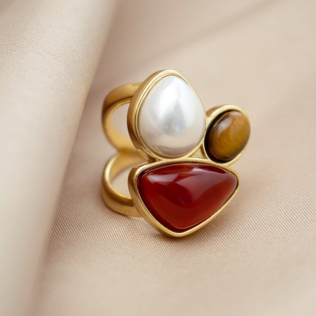 Elevate your accessory game with our Fusion Spell Ring. This classic and sophisticated 18k gold ring features two gemstones and a pearl shell in unique cabochon formats, creating a timeless and luxurious look. A must-have for those seeking an exclusive and refined touch to their ensemble.